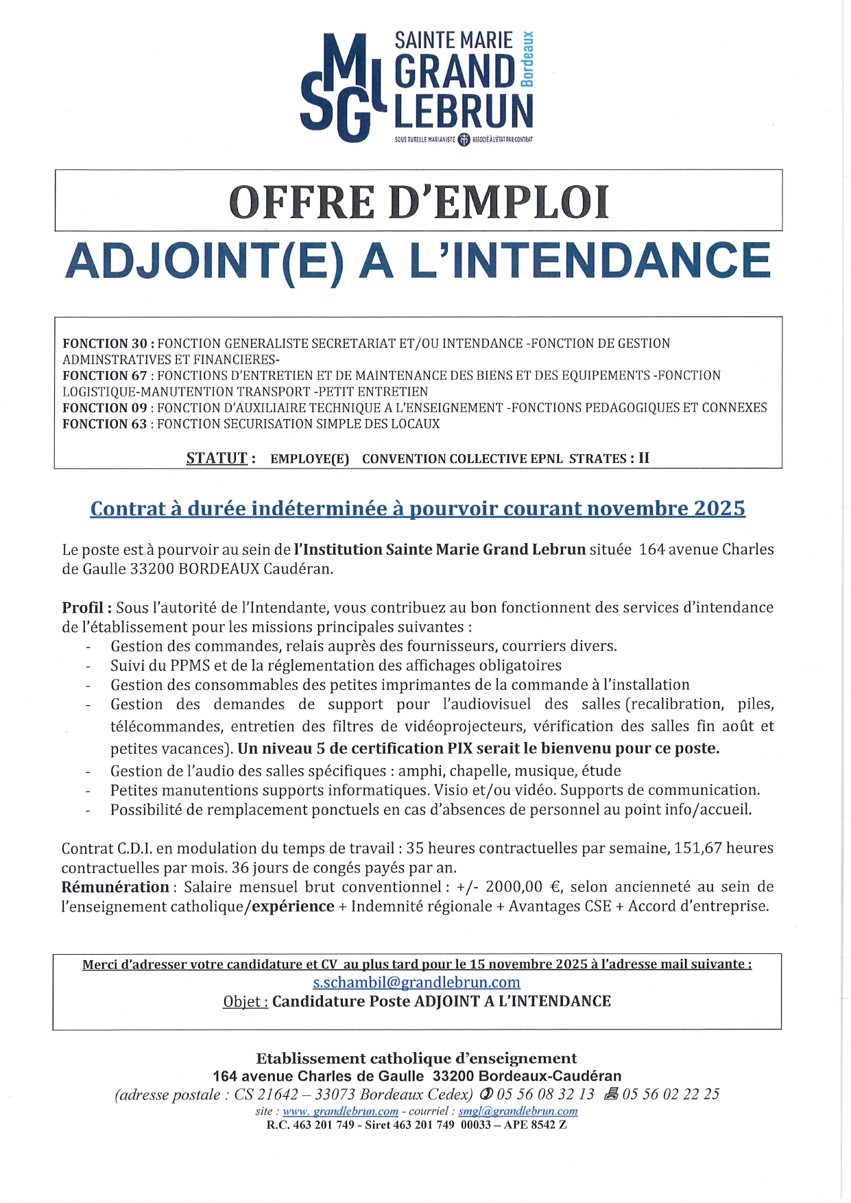 L’ensemble scolaire Sainte Marie Grand Lebrun recherche un(e) adjoint(e) à l’intendance .
